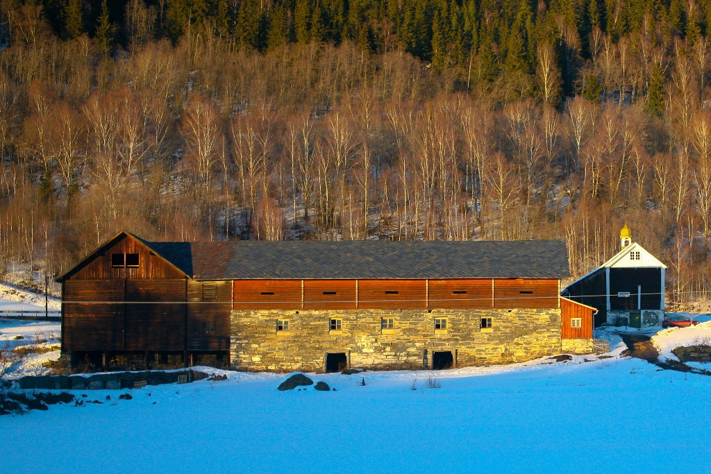 Gårdstunet med sin karakteristiske plassering er et viktig element i kulturlandskapet og byggeskikken forteller mye om hvor i landet vi befinner oss. Her fra Ekne i Nord-Trøndelag.