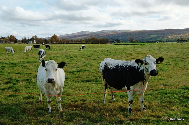 Telemarksfe (t.v.), Sidet Trønderfe og Nordlandsfe og svensk Fjällko er nordiske raser med sidet fargemønster.
