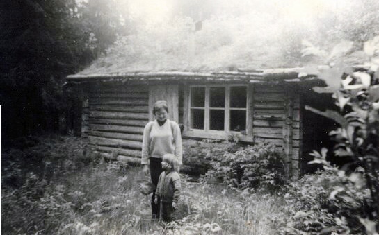 Skogstua i Bjørgfjellet, vest for elva Ferja, der kvinner og barn søkte tilflukt under krigshandlingene. Bildet er tatt etter krigen.