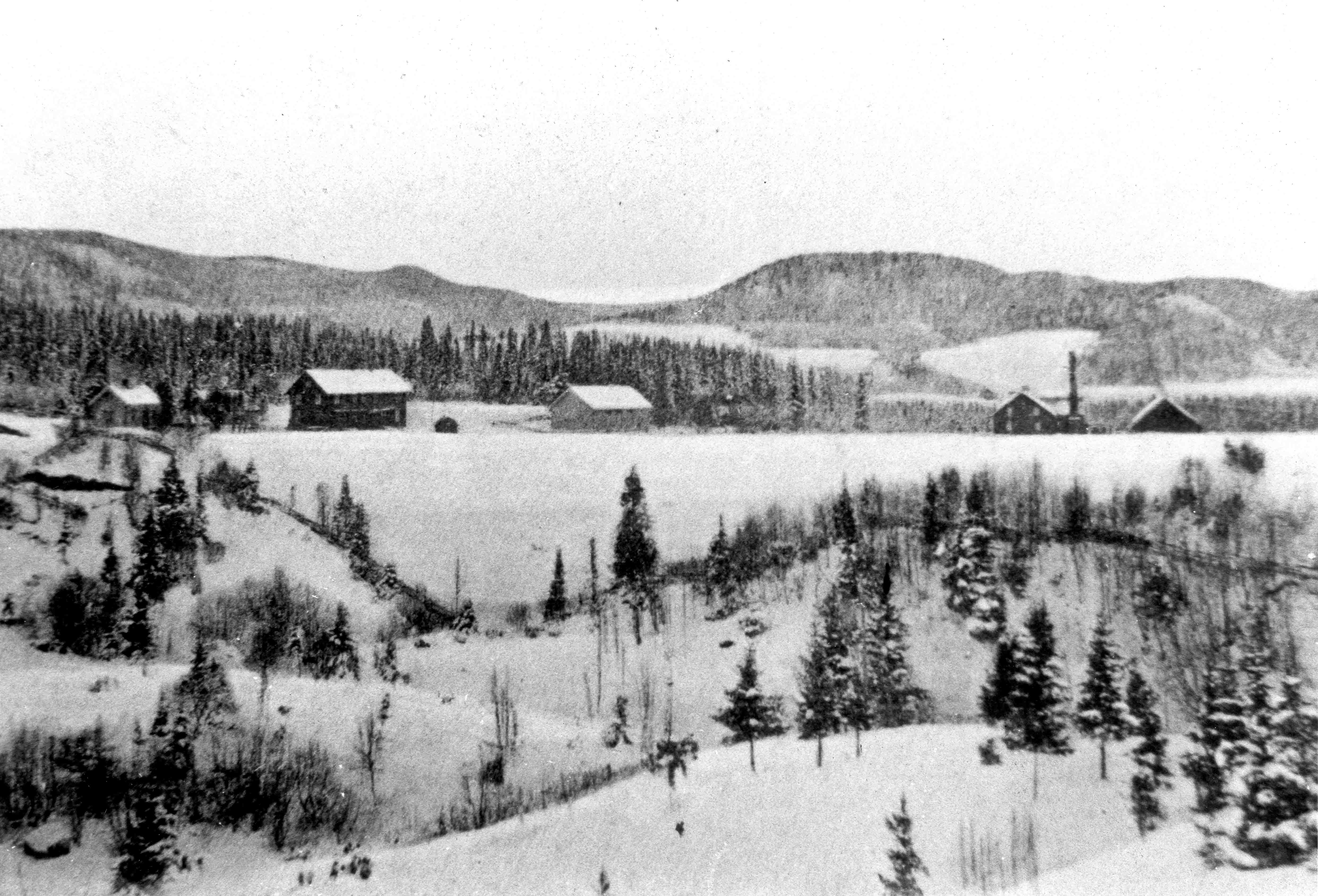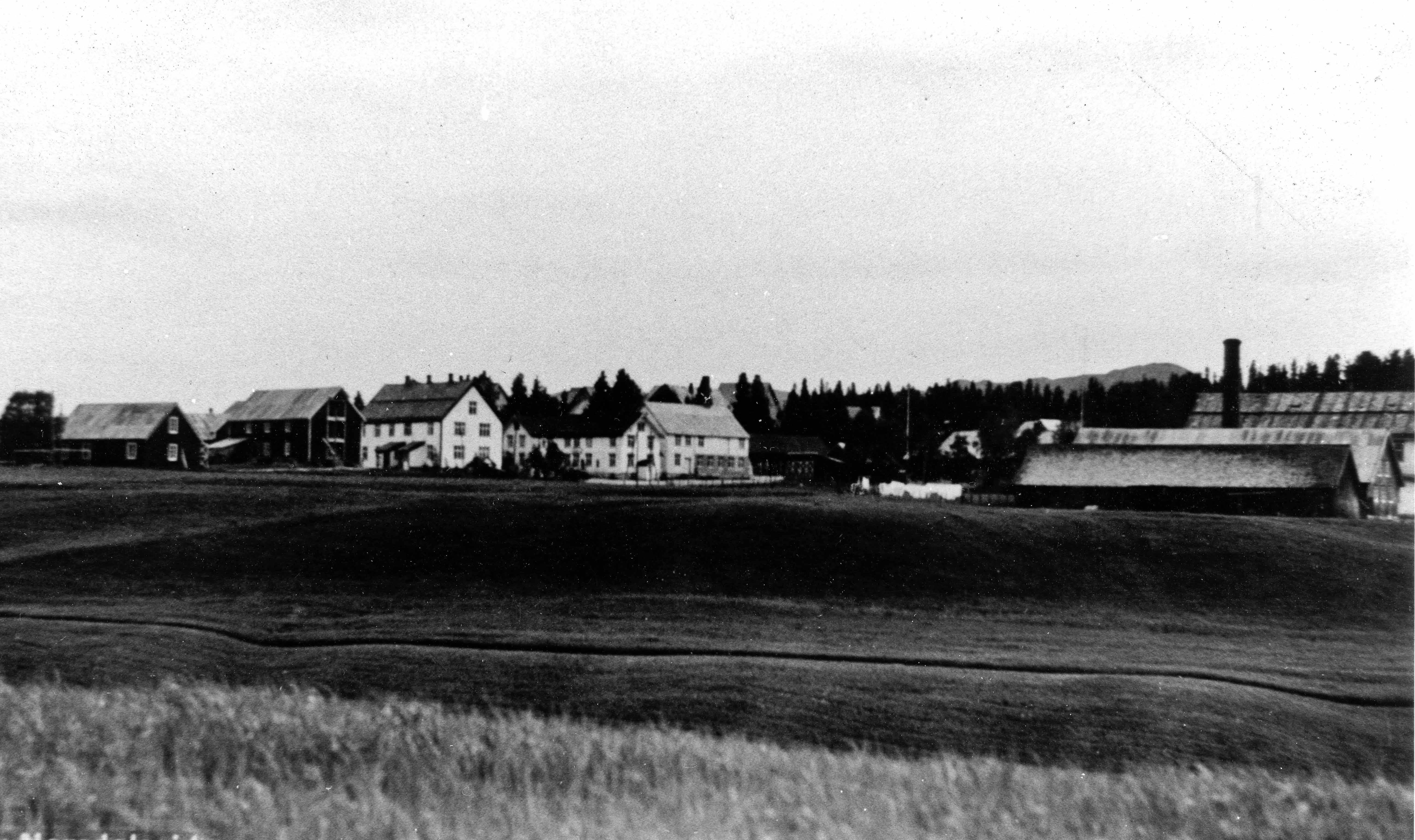 Namdalseid sentrum sett fra sør-øst med meieriet til høgre i bildet. Dette fotografiet er tatt flere år før bombeangrepet, men til tross for at datoen var 30. april lå det fortsatt mye snø den dagen i 1940, og bildet gir et inntrykk av hvordan landskapet så ut da flyene kom.