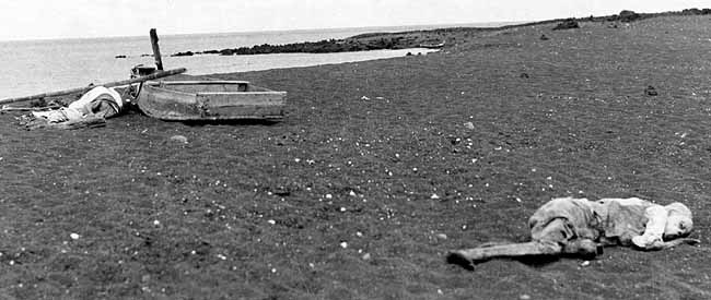 Likene av Trygve Nuggerud og Rudolf Lorenz på Isla Marchena slik de ble funnet. Nuggerud ved båten.