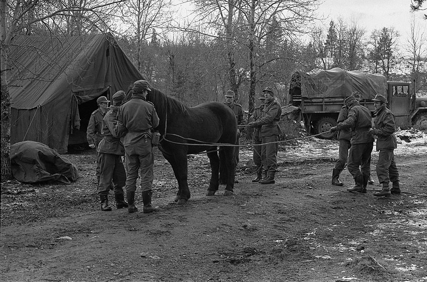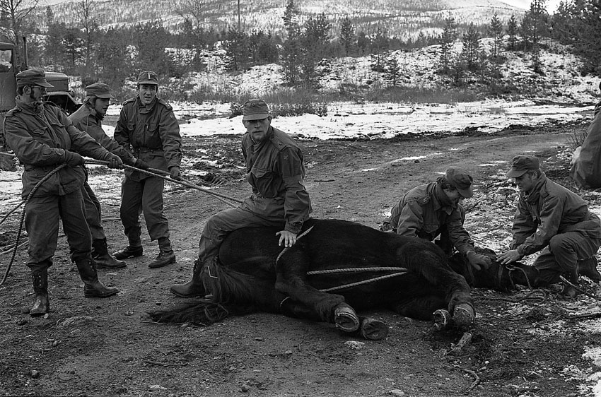 Kasting ved bruk av «cowboymetoden» under feltøvelse med Kløvkompaniet i Troms i 1972. «Nova» hadde tråkkskader i kronranda på en bakfot og tillot ingen behandling stående. Som det framgår av bildene ble tauet lagt rundt bakbeina over hasen. I amerikansk litteratur anbefales det at tauet legges i kodebøyen, noe som gjør det lettere å få hesten til å legge seg. Uansett, dette anbefales ikke for amatører!