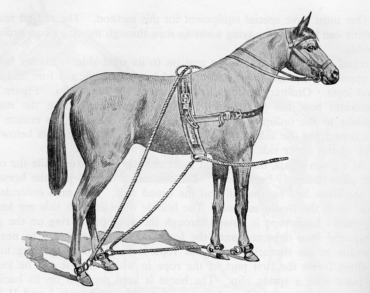 Hesten blir utstyrt med heller nedafor koden på alle fire bein. Det er kraftige polstra lærreimer forsynt med metallringer. Fra hella på nærmeste frambein føres et tjukt reip gjennom ringene. To mann på motsatt side av den hesten skal falle på trekker i dette reipet som har til hensikt å snøre beina sammen. På enden mot hesten har tauet i en kjetting med grove ledd som gjør det mulig å låse beina sammen med en kraftig karabinkrok når hesten ligger på bakken med beina samla. Et annet reip festes ved albuen på frambeinet som skal vende opp, føres over manken og betjenes av to mann som skal sørge for at hesten faller til riktig side. Det samme skal hode- og halemannen bidra til, samtidig som de ved bruk av egen kroppsvekt skal sikre at hesten blir liggende når den vel er nede.