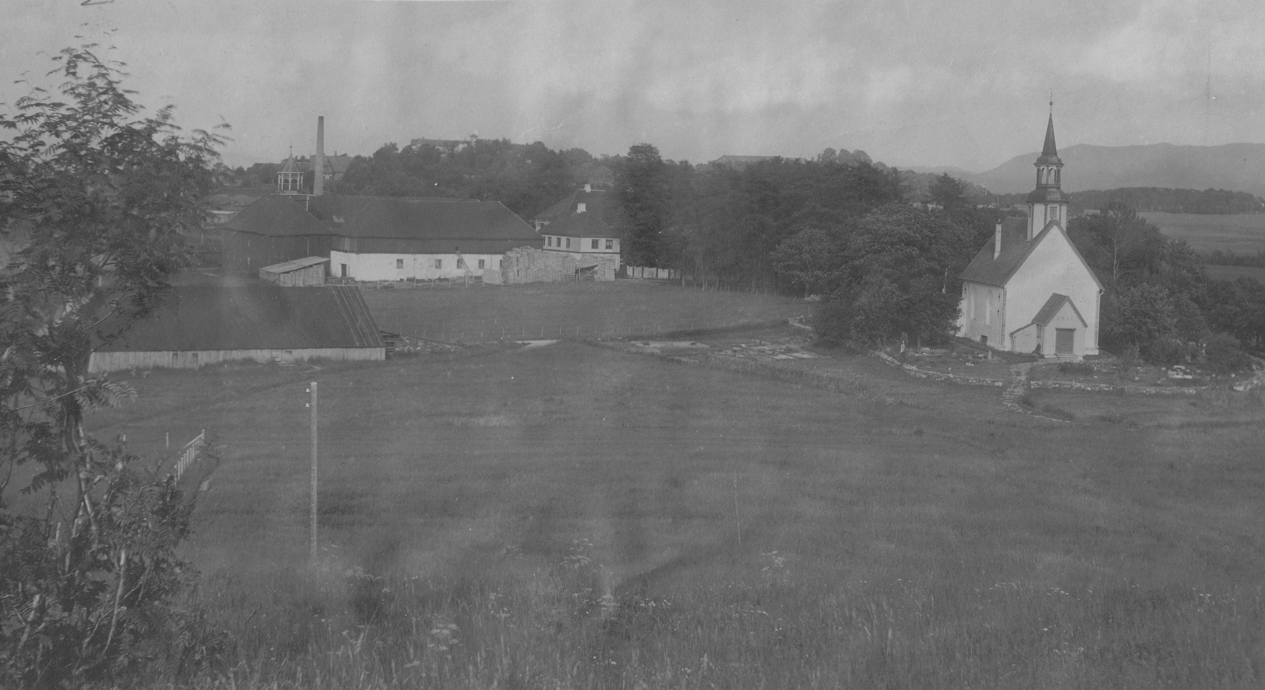 Lade kirke og Lade gård sett fra Grønnlia ca 1920. Foto: Trondheim byarkiv.