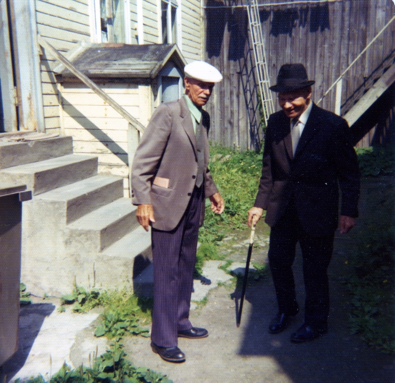 Bestefar (med hatt) og broren Karl på gamle tomter i 1975. Til høgre foran Strandveien 37 på hjørnet mot Nordtvedts gate, det andre i bakgården. Karl var født i 1891 og emigrete til USA etter konfirmasjonen. Norgesbesøket i 1975 var det eneste han foretok, og brødrene hadde ikke sett hverandre på nesten 70 år. Egne fotos.
