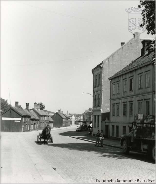 Strandveien sett fra krysset med innherredsveien der innslaget til Strindheimtunnellen er i dag. I gamle dager kaltes dette området for «Åtet» fordi fiskerne gravde mark til agn i Roseborgfjæra her før TMV ble anlagt i 1872. Foto: Trondheim byarkiv.