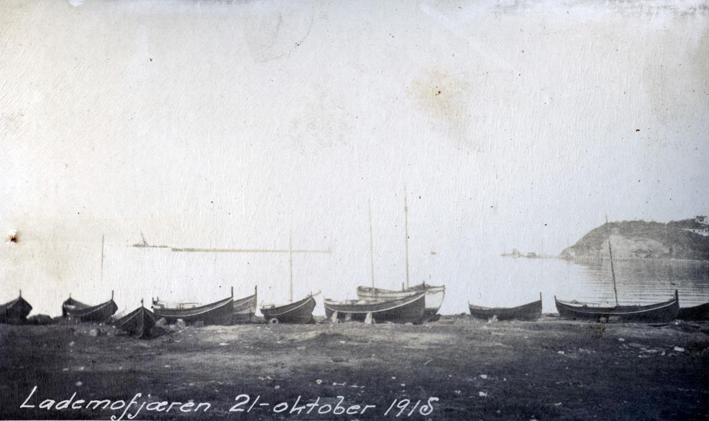 Lamofjæra i 1915, omtrent der Dora 1 ligger i dag. Båtene er med unntak av en enkelt alle av Åfjordstypen og ble brukt til fiske på fjorden. Foto: Trondheim byarkiv
