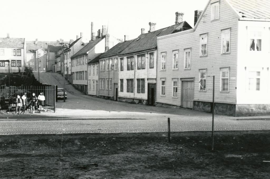 Nordtvedts gate på 60-tallet. I forgrunnen til venstre Strandveien 37 der familien Simonsen bodde i første etasje. Det i dag er borte og det nyoppførte nr 37, tegna av arkitektene Brendeland & Kristoffersen, ligger lenger vest tvers over innløpet til Nordtvedts gate. Foto: Privat
