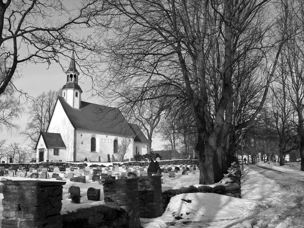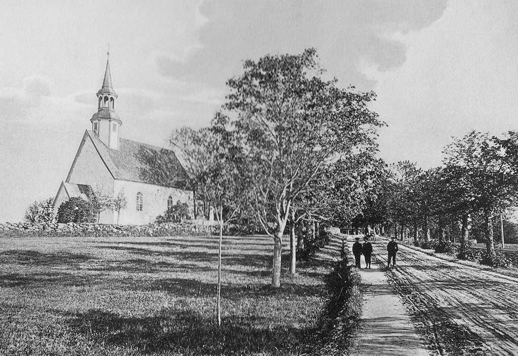 Lavei’n nedover forbi kirka på den tida Emil var gårdsgutt på Lade til venstre. På bildet til høgre fra 2011 er kirkegården utvida og trafikken går langs Jarlevegen. Fotos: Tronheim byarkiv og Erik Stenvik