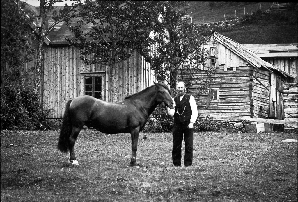 Da æ kom hjem ta æksis æ, veit du, så holdt æ på og pussa dender hesten, så han va jævli pen og blank og fin. – Han kalt’n for Borken, men han va no itj borkat, – lys brun, pen hest, nokså stor og. Og så va det ein dag han sa: ”Kan du itj kjør herre vogna ut te’n Johan Vikaraunet”, sa’n. Han ha lånt ei vogn av ’n Johan Vikaraunet, ei lo-vogn. Jaja, æ skoill kjør utover derre vogna, æ. Og så, når æ skoill tebakers, så sætt æ mæ på og ridd æ, veit du. Når æ kom over brua, og så om svengen, så sjer æ husan te Loraas. Og så sætt æ’n i galopp, æ sjø, så’n lå nokså flat. Med det samma æ kjæm om svengen, så e det ein som brøle: ”Det e itj nå’n kavalerihest, derre!” Han sto ne’på myra der han, ne’om vei’n. Nei, han tålt itj derre han. Han va jævli snill med hesten, han va for snill. Han fekk da for lite mosjon, dender hesten.