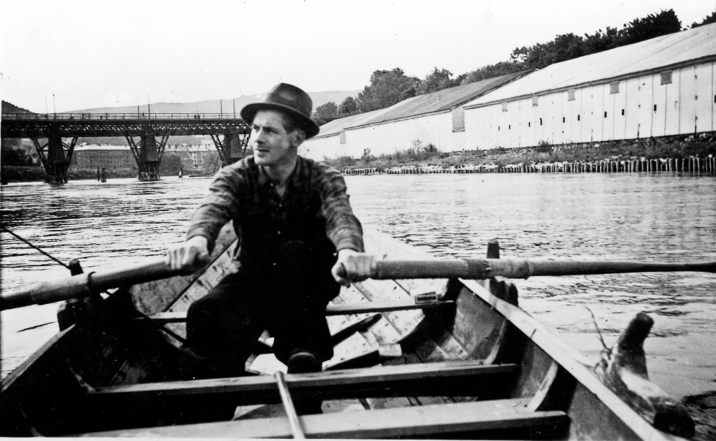 Emils sønn, Sigfred Simonsen, dorger etter laks og ørret i Nidelva etter krigen. Bildet er tatt før arbeidet med den nye Elgeseter bru ble starta i 1949. Til høgre Marinen med lagerbygningene som for lengst er borte. Privat foto.