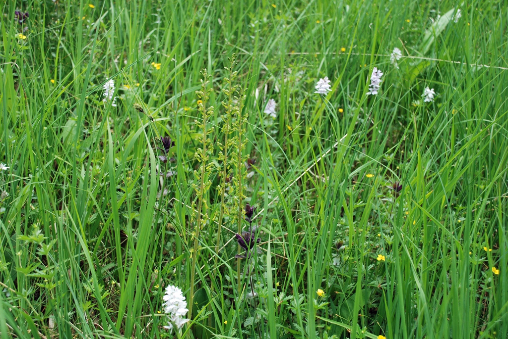 To utgaver av slåttemyr, til venstre fattig til intermediær myr med karakteristisk innslag av rome I Namdalseid, til høgre rikmyr med orkideer som marihand og stortveblad i Høylandet. Foto: Erik Stenvik