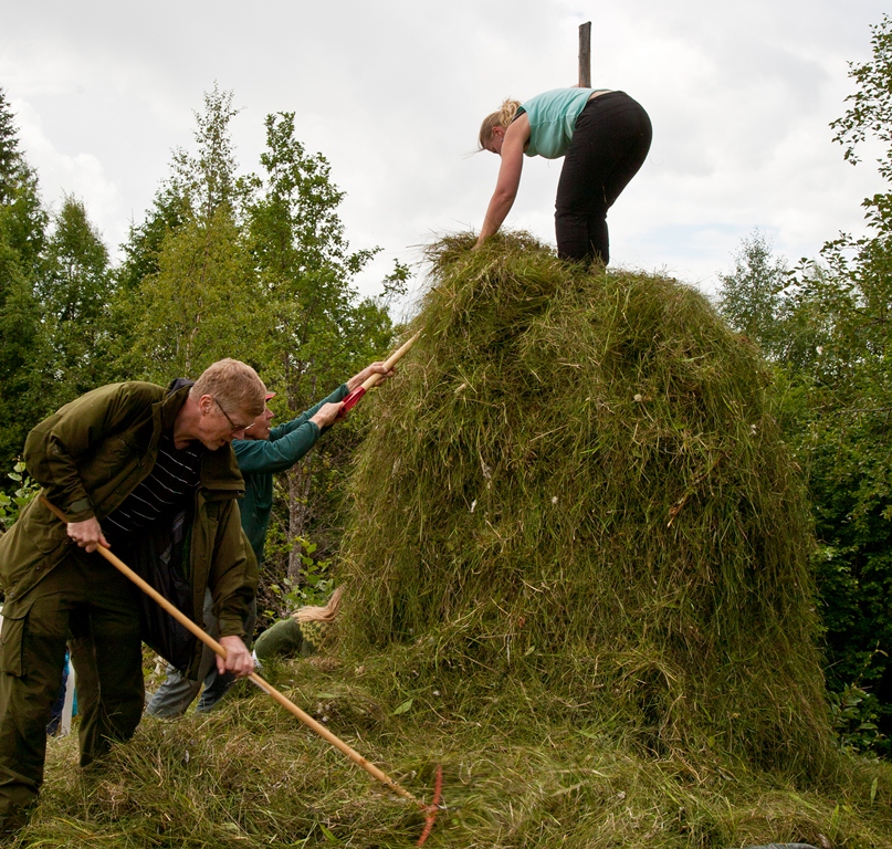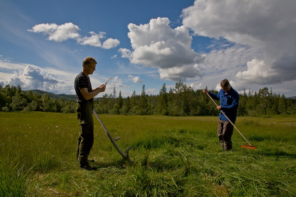 Myrslåtten foregikk ved hjelp av ljå og rive og høyet ble lagra i stakk eller løe. Fra slåttedag på Høylandet i 2012. Foto: Erik Stenvik