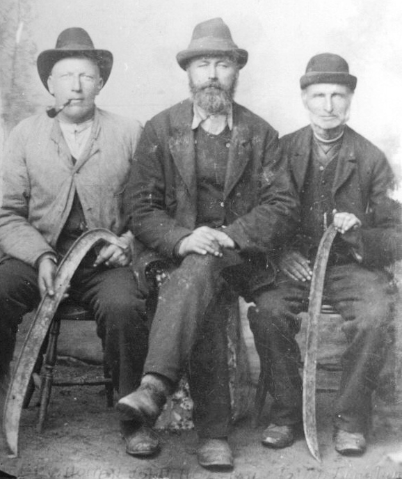 Tre ljåsmeder fra Namdalseid på marknadsferd med produktene sine. Fra venstre Edvard Tinglum (1855-1940), Johan Holstad (1848-1935) og Edvard Rosset (1835-1930)